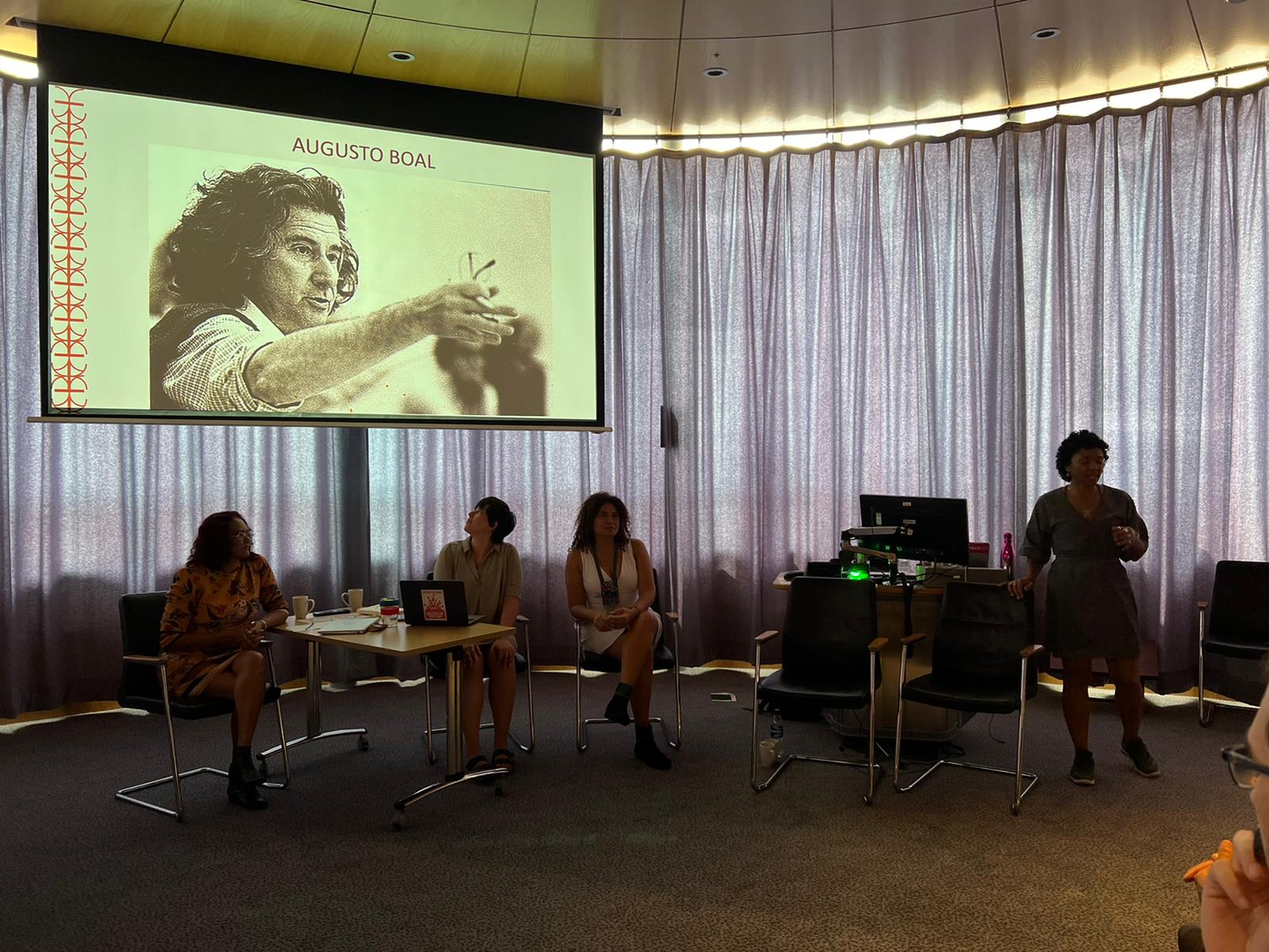 Is a theatre method developed by Brazilian dramaturg Augusto Boal whose aim is to transform oppression by using cooperative techniques amongst participants to overcome injustices. Its transformative proposition is that change can be creative, starting from our own experiences, and it can help us not only to face inequalities but to see the world from a different/freeing perspective.